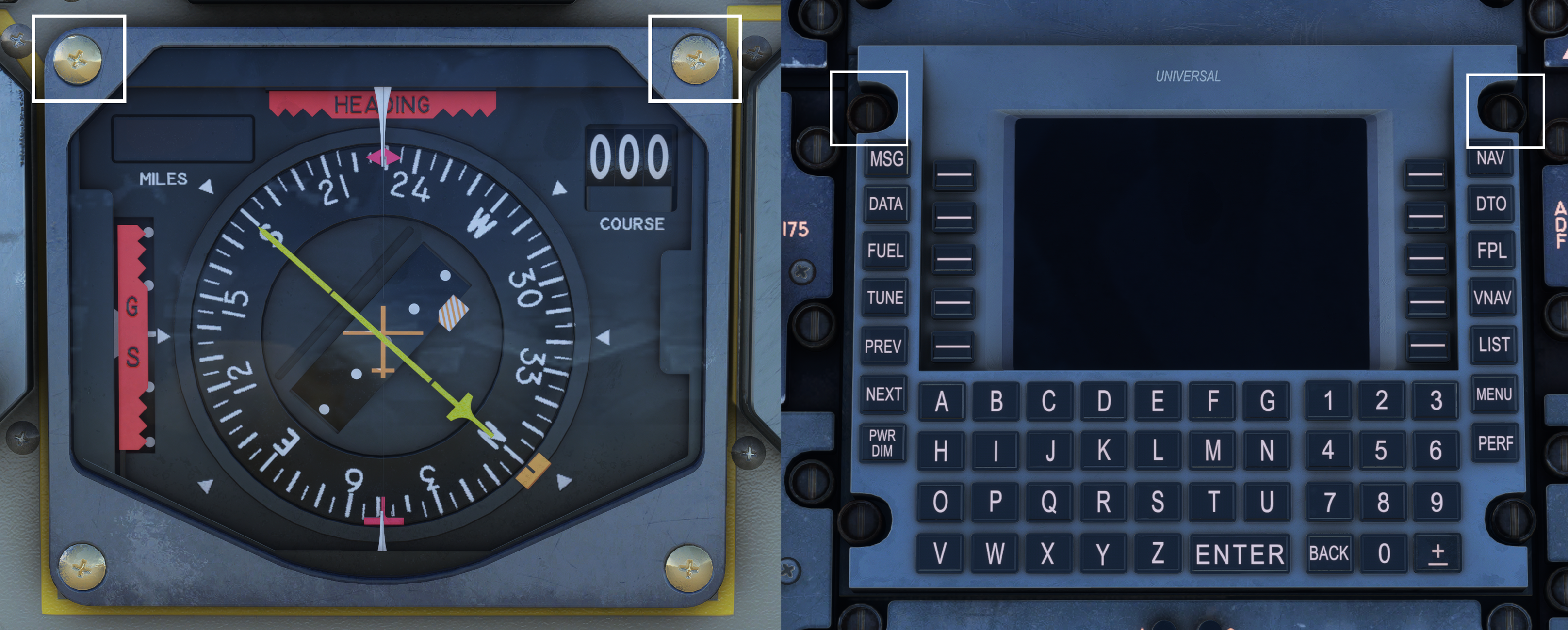 As a quality of life addition, a selection of hidden clickspots are placed on screws on the Captain’s and First Officer’s HSIs, as well as on the screws around the UNS-1; these can be used to quickly move the camera between the ‘Pilot’, ‘UNS-1 FMS’ and ‘Co-pilot’ camera presets.